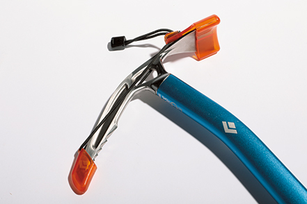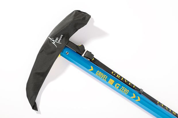 電車やバスなどの公共交通機関で登山口までアプローチする際や、登山中にアイスアックスをバックパックに取り付けてストックで歩く場合などは、周囲の人や物を傷つけないように、ピックとブレード、スパイクもプロテクターで保護してあげよう。ピックには短くカットしたゴムホースをプロテクターとして取り付けている人も多い。