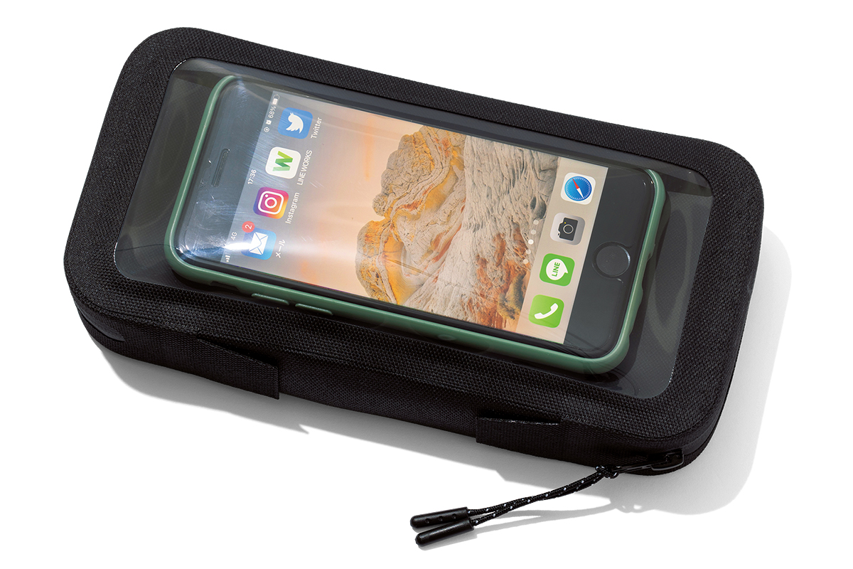 スマートフォンポケットは、現在市場で出回っているもっとも大きい携帯電話を収納できるサイズ設計で、表側生地に透明ビニル素材を採用しているためケースを開けなくとも画面を確認することができる。さらにはキーケースや日焼け止め、リップクリームなどのちょっとしたものも入るので、これひとつで最低限身に着けていたい小物をまとめて収納できてしまう。「あれ、どこいった?」というトラブルも、これで解決だ。バックカントリーで使用することを前提としているので生地はもちろん耐水仕様。今期のフィールドで、ぜひご活用を!
