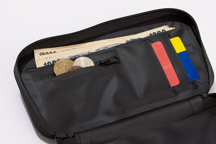 特筆すべきは名前のとおり、スマートフォンケースでありながら、サイフとしても使える点。厚みをもった立体長方形の箱型ケースに止水ファスナーを3辺にわたって取り付けているので大きく開閉し、片側にスマートフォンポケット、もう片側にはサイフの機能を備えている。折らずにしまえるお札ポケット、カードポケットがふたつ、ファスナー付きのコインケースが付属しサイフとしての使い勝手も十分だ。