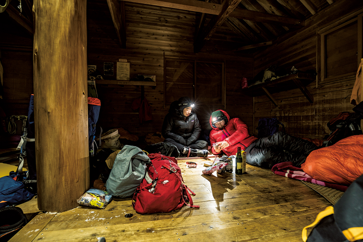 パタゴニアチームとのBCツアーは、気がつけば小誌の恒例企画になっている。今年はパタゴニアから5名。神田店の押尾崇弘、仙台店の竹内一郎、IT部門を担当する上うえ悠太、遅れて白馬店から林誠が駆けつけた。リーダーは、同社で広告をはじめとしたビジュアル部門を統括する島田和彦。島田は、人知れず存在する斜面を探しては、その初滑降を狙うハードコアなクライム&ライドの実践者だ。板を担いでアックスとクランポンで20時間かけて登り、滑るというようなことをしている。ひとことでいうなら変態ですね。