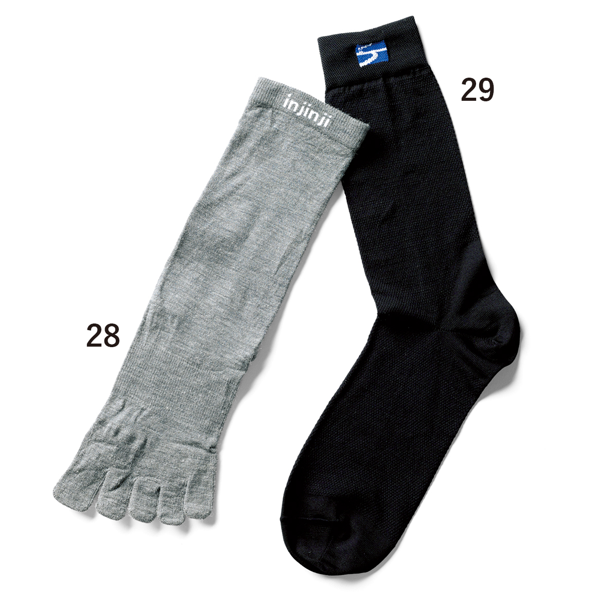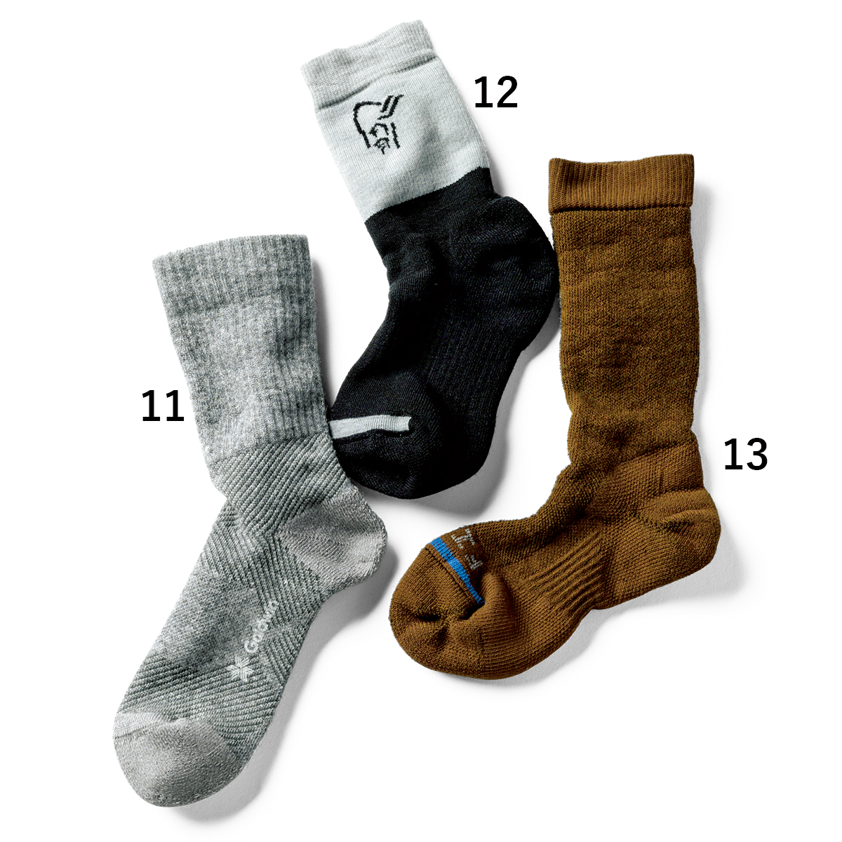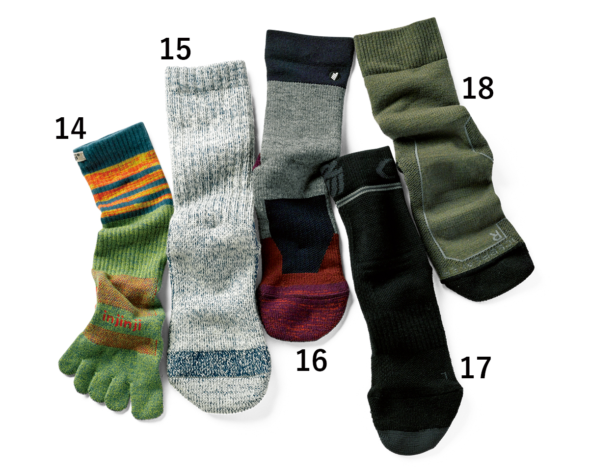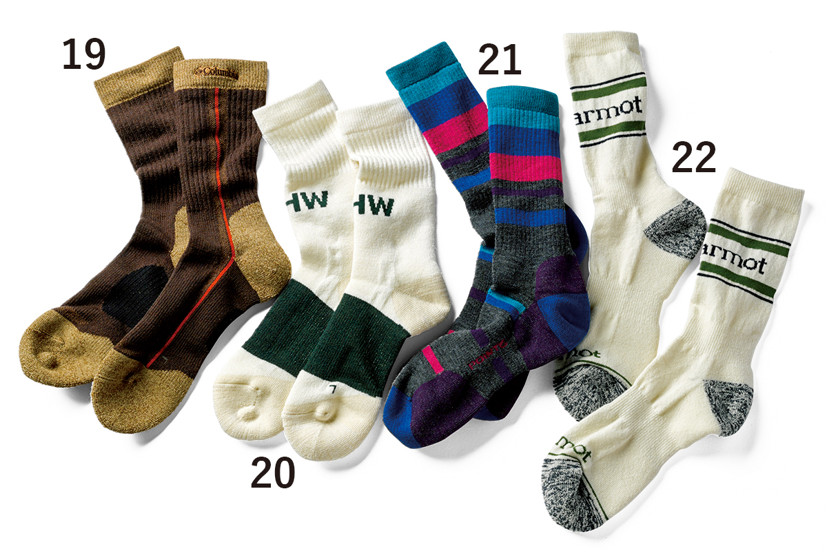 登山中にもっとも動いている足先を守っているのがソックスだ。とくに足先は想像をはるかに超える発汗量があり、地面と接する衝撃を吸収、疲労の蓄積は計り知れない。ほんの小さな石や葉が入っただけでも違和感を持ち、ときにそれが原因でマメや靴擦れになることもあるくらい繊細だ。だからこそ足の形状に沿い、激しい動きのなかでもズレにくいことが重要。また寒い季節には確かな吸湿速乾性と保温力で冷えを防いでくれる。今回は29足のソックスを選んだが、購入にあたってはシューズ同様に試着をして、フィット感を確かめてほしい。登山中の足のトラブル防止はソックス選びからはじまっている。