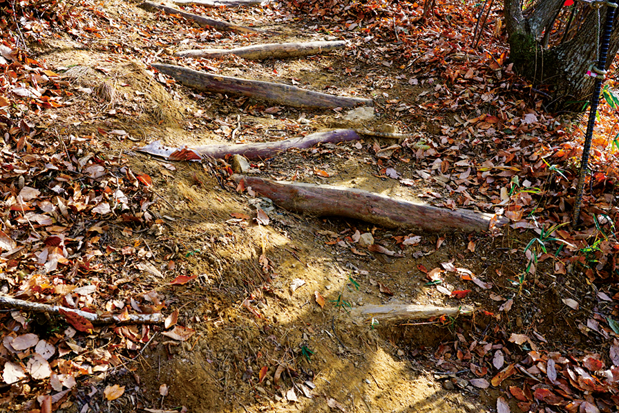 近自然工法で整備された登山道。現地調達した資材を使い、水はけを考慮してジグザグに組んでいるのが特徴的だ。