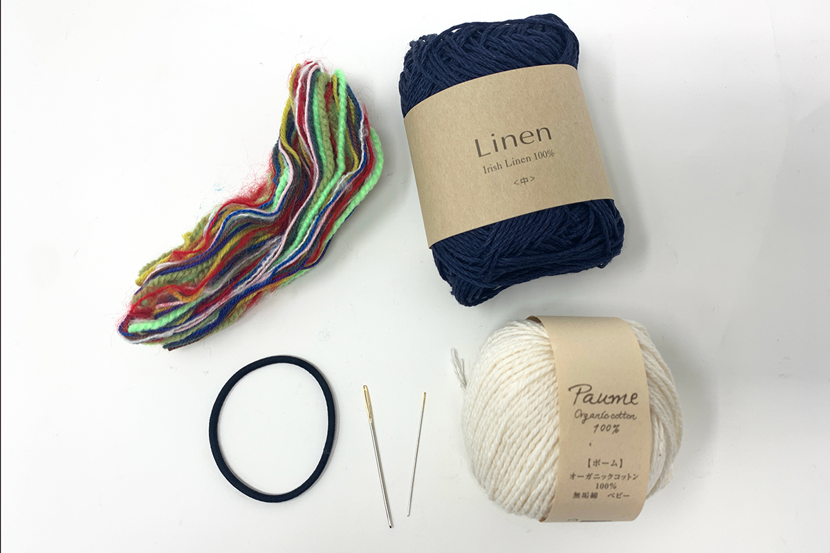 1 ダーニングマッシュルーム以外に必要なもの。布を固定するためのゴム、縫い針、糸。糸は補修する生地に合わせて選ぶ。