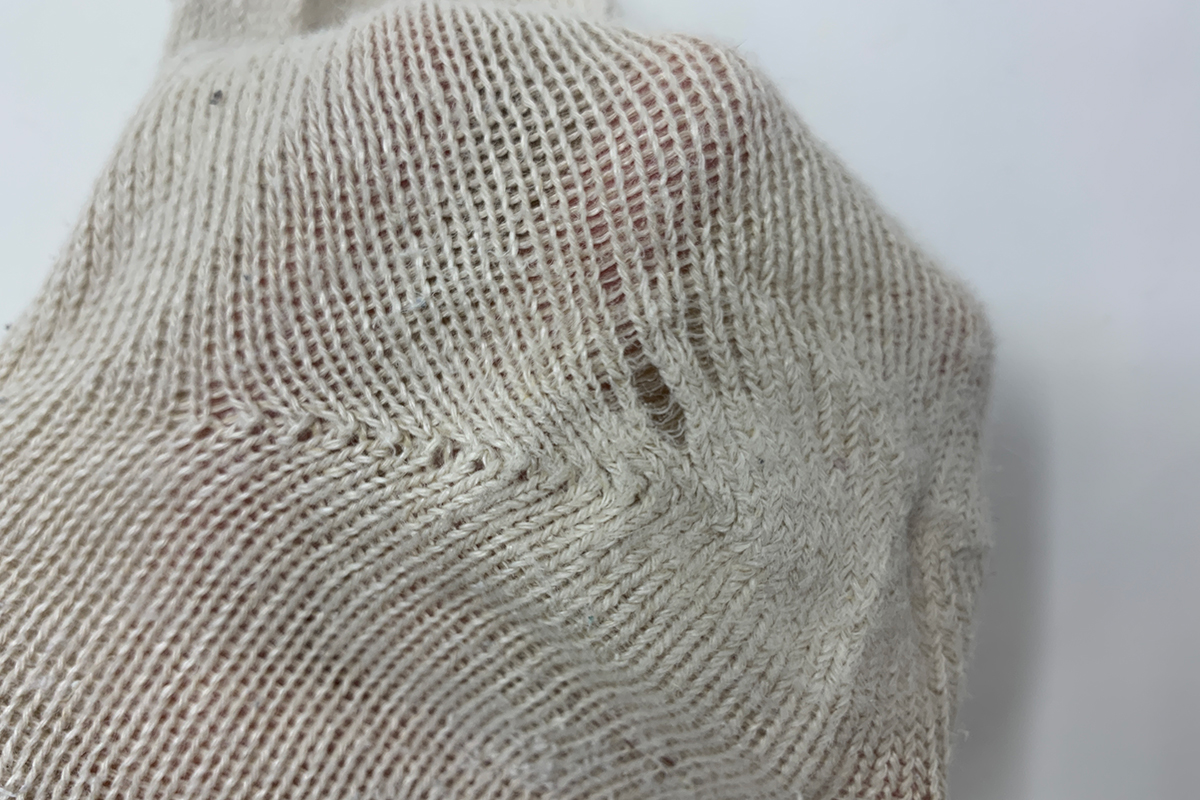 子どものズボンの股部分と、穴の空いたリネンの靴下。