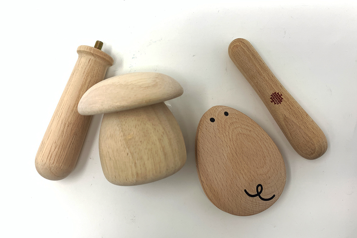 ダーニング作業中、生地に適度な張りをもたせるために使う道具。名前の由来はその形状から。大きさはさまざまで、キノコ柄にペイントされているものもあり、コレクション心をくすぐられます。キノコ型はクロバー社のもの、右ふたつは雑誌のキットのものです。