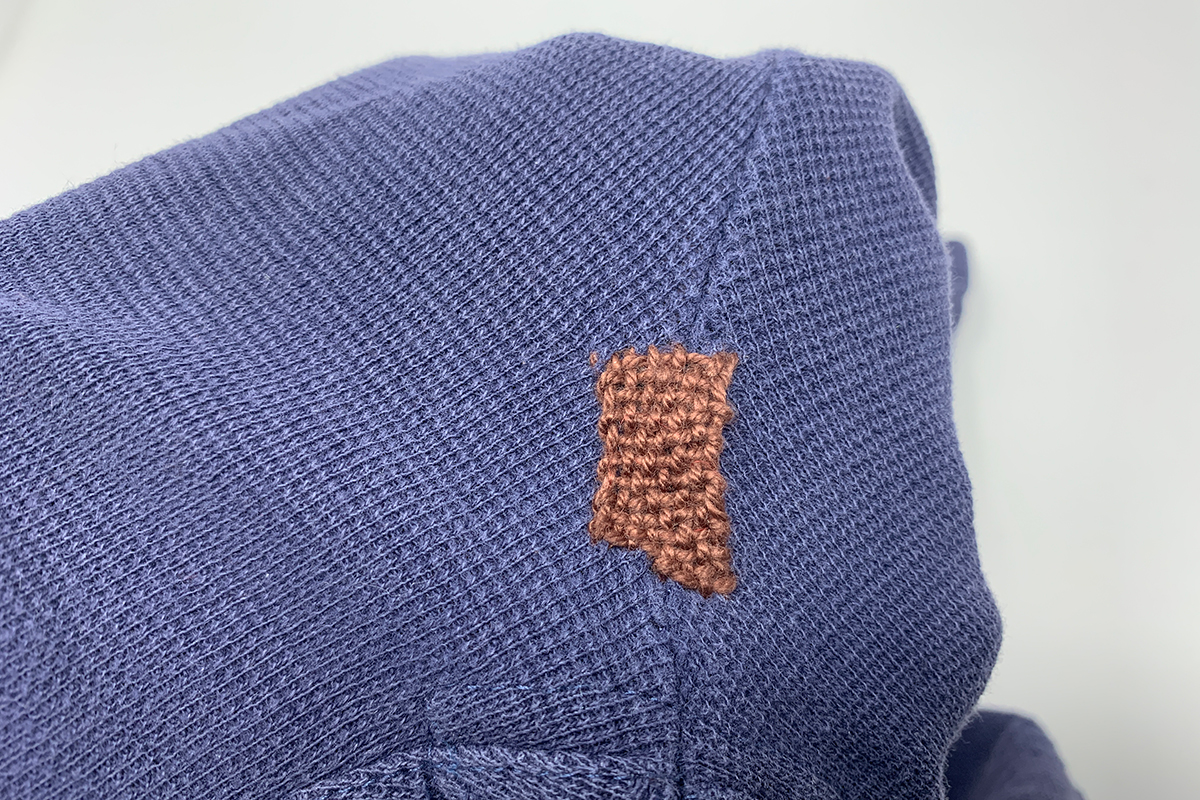 縫い進め方は機織りのイメージです。ピンと張られた縦糸に横糸を上、下、上、と通していく。いきなり細い糸でチャレンジすると、すくい漏れや生地もいっしょにすくってしまったりなどの失敗が起こりやすいので、まずは太めの毛糸がおすすめ。ベ ースレイヤーの襟や裾、フリースジャケットの前立ての縁部分からはじめるといいでしょう。2×2cmくらいの補修でも、仕上がると充実感あります! ほかにも穴空きウエアがないか探したくなるはず……。