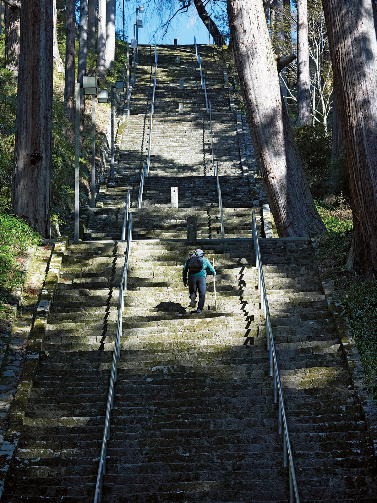 ここは日蓮宗総本山・身延山。山全体が修行の場であり、全国から多くの参拝者が訪れる聖域だ。その入口にある立派な三門をくぐった先に「菩提梯(ぼだいてい)」と呼ばれる壁のような階段が現れる。段数287段、その高低差104m。ここを登りきった者は、煩悩が断ち切られて悟りの境地に達するといわれている。
