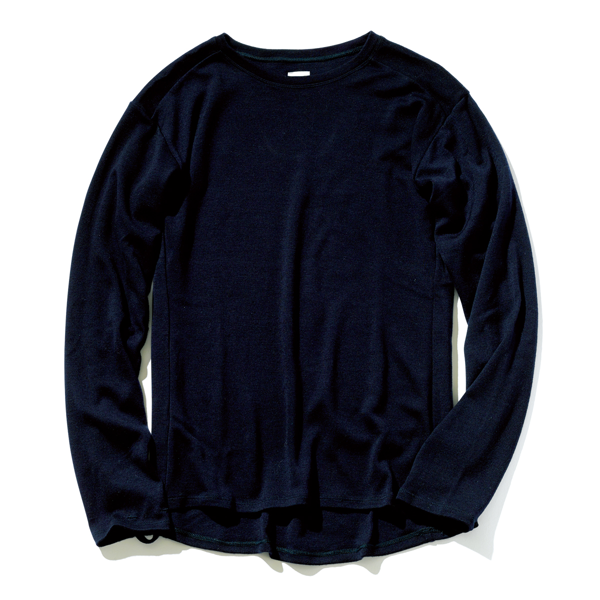 中厚に満たない絶妙な厚さで、残暑を感じる秋口から春の陽気に包まれる残雪期まで、ロングシーズンで活躍する。光沢のあるなめらかな生地は、柔らかい肌触りで気持ちがいい。トップスはクルーネックも展開する。