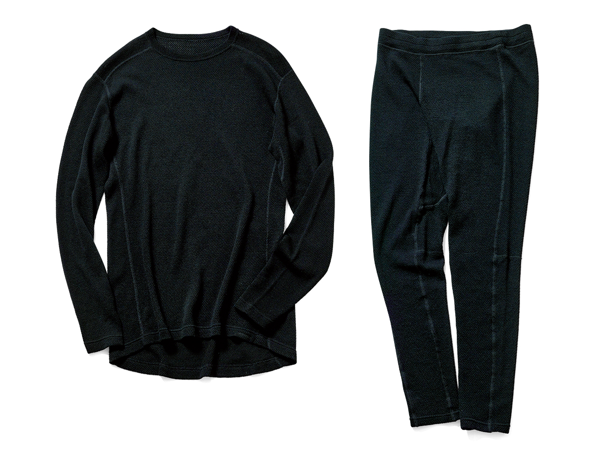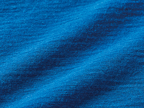 保温・調湿性に優れるメリノウールと、発汗時に汗の蒸散を促進し、寒冷時には保温性を提供する「サーモクール」という化学繊維を、50対50の割合で混紡。薄手の生地なので、厳冬期を除く春夏秋冬で活躍する。