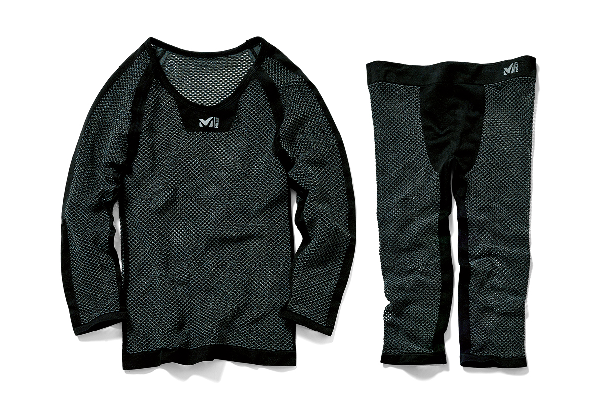 肌に直接着るアンダーウエア。かさの高いメッシュ生地が汗を吸い上げるとともに、濡れたベースレイヤーを肌から遠ざけて汗冷えを軽減。さらに、ウエア本体が空気の層となって体温を蓄えるので、暖かさにも包まれる。