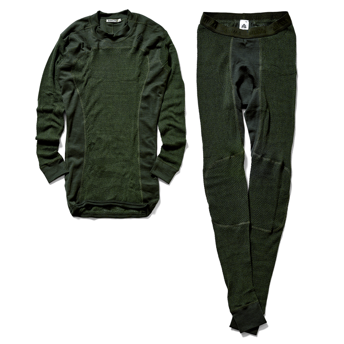 こちらはベースレイヤーの下に着るアンダーウエア。メッシュの生地がベースレイヤーとの接点を減らすことで汗冷えを軽減し、細かい網目に体温を閉じ込める。ウールの柔らかい肌触り、調湿性の高さにも注目したい。