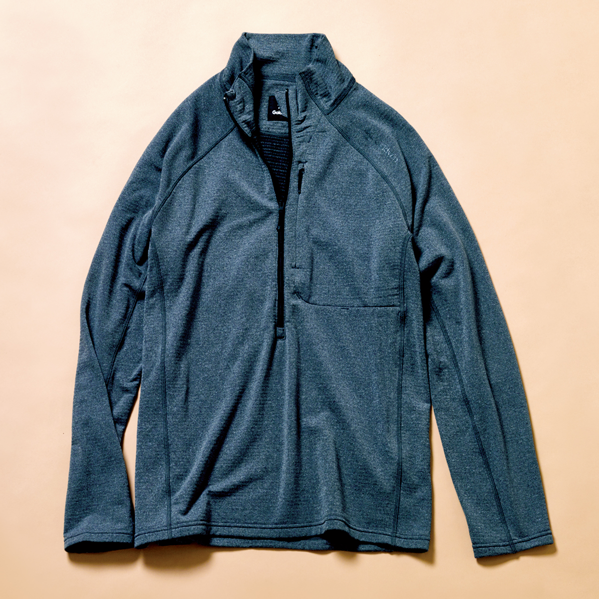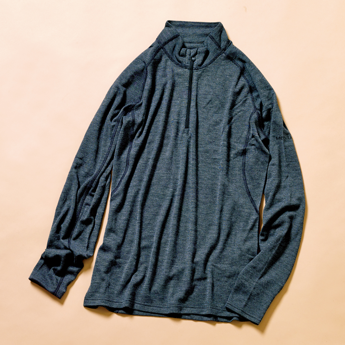 ほどよい保温性がある19.3マイクロメートルの極細メリノウールと、透湿性を備える植物由来の繊維テンセルを混紡。肌面は体温をキャッチするパイル構造で、肌触りもなめらか。薄手のミッドレイヤーとしても活用できる。
