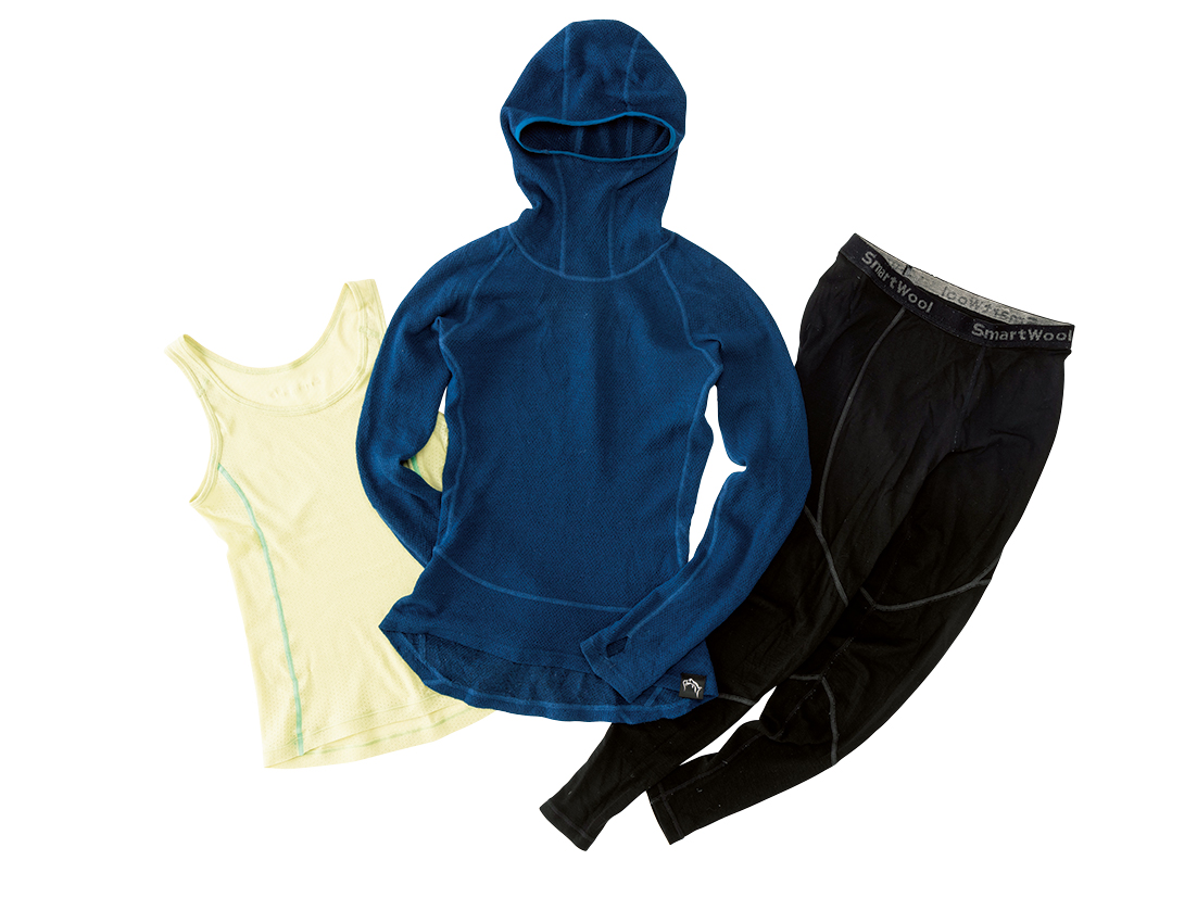 上はハイブリッドウール、その下にメッシュ地のタンクトップを着用。下はメリノウールのロングタイツ。行動時に着用。