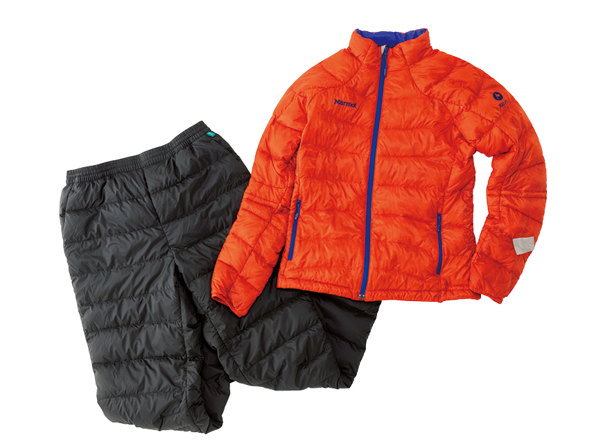 700FPダウン上下。小屋ですごすときや外に出るときに着用。