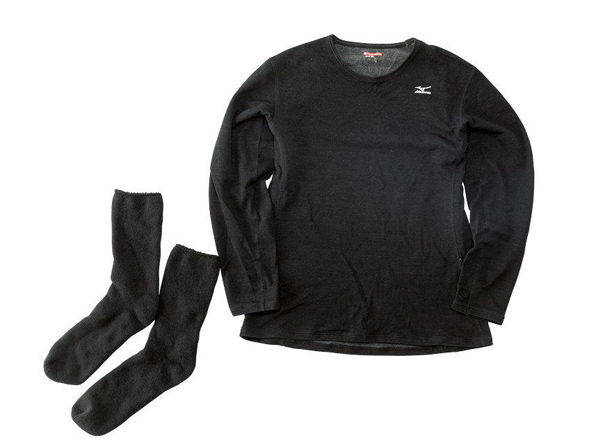 つねにドライに保つ必要がある雪山。予備のソックス持参は必須。ソックスは毎回新品状態を心得る。ヘタれてくるとブーツのサイズ感も変わり、保温性も失ってしまう。サイズ感を変えないために同じものを持つ。薄いバラクラバorネックゲイターに