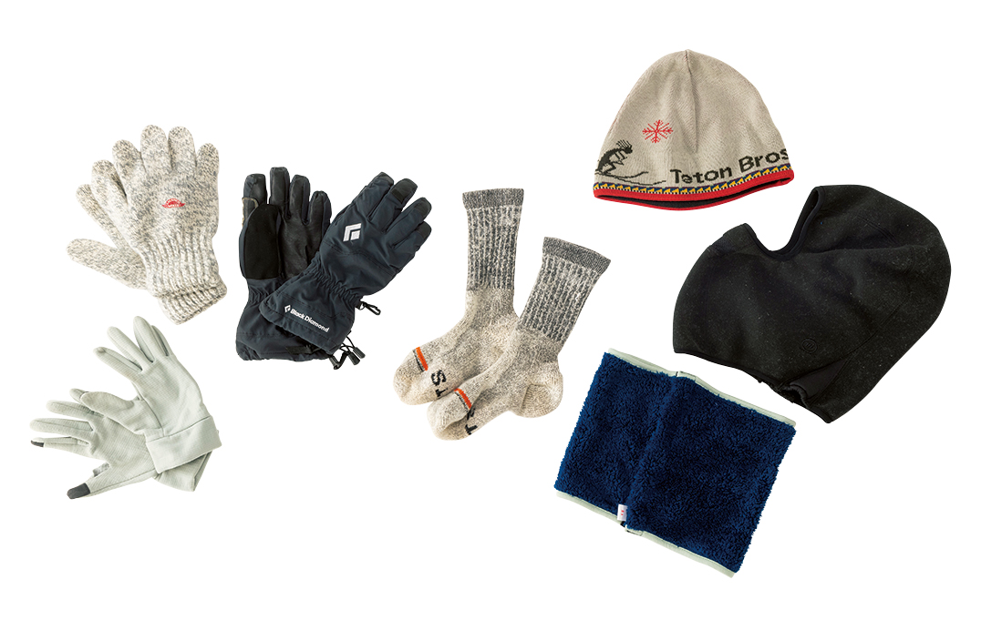 ニットのビーニー、フリース製バラクラバ、フリース製ネックゲイター、ソックス、防水保温材入りグローブ、ウールの厚手グローブ、薄手の防風グローブ。