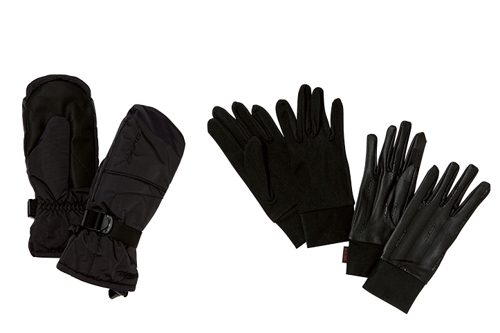 手足がいちばん寒くなりやすいのでミトンタイプの撥水保温性素材のグローブがおすすめ。メイングローブに保温素材をチョイスすれば、インナーグローブは薄くてOK。予備のインナーも同じものをチョイスする。