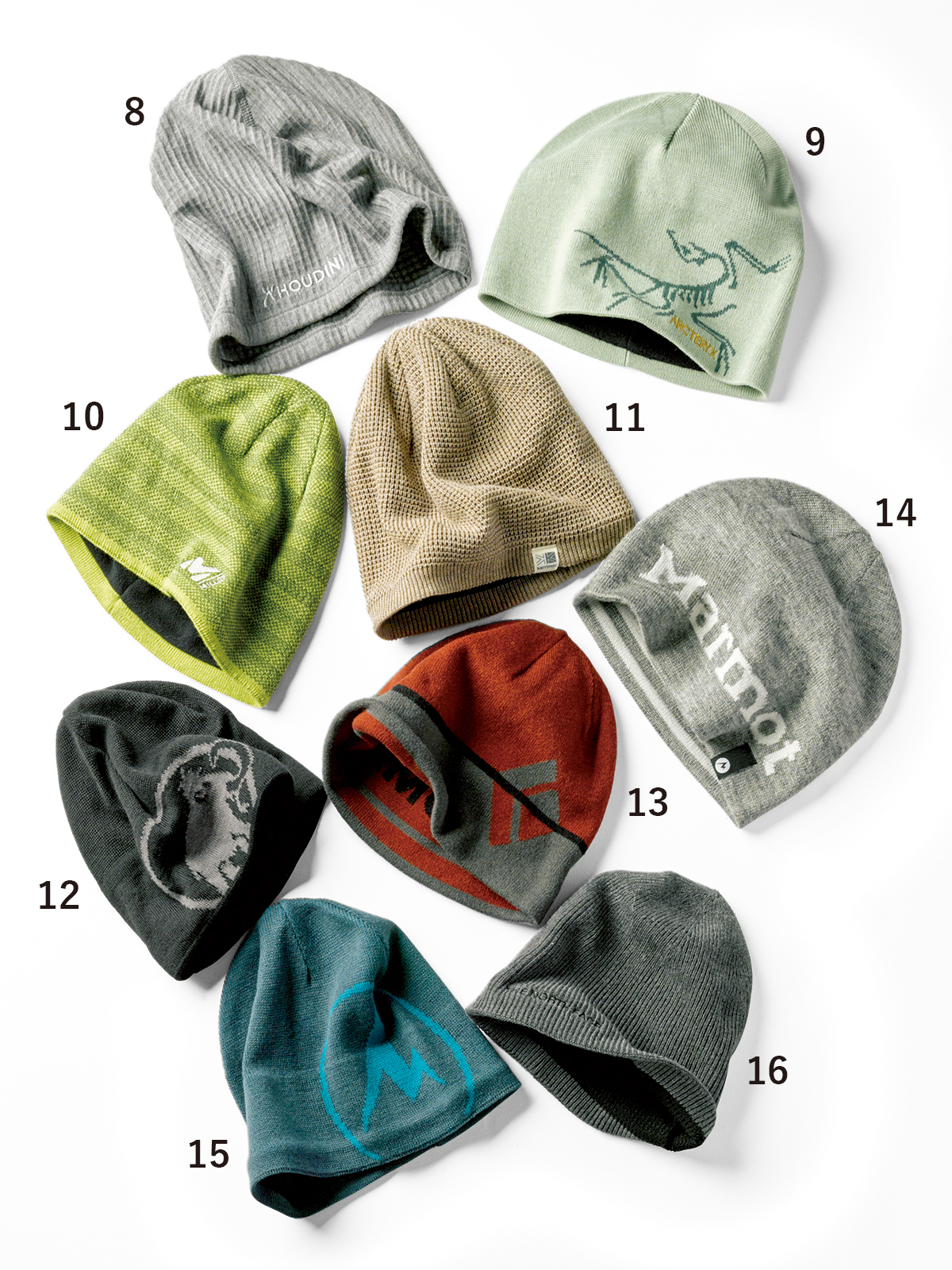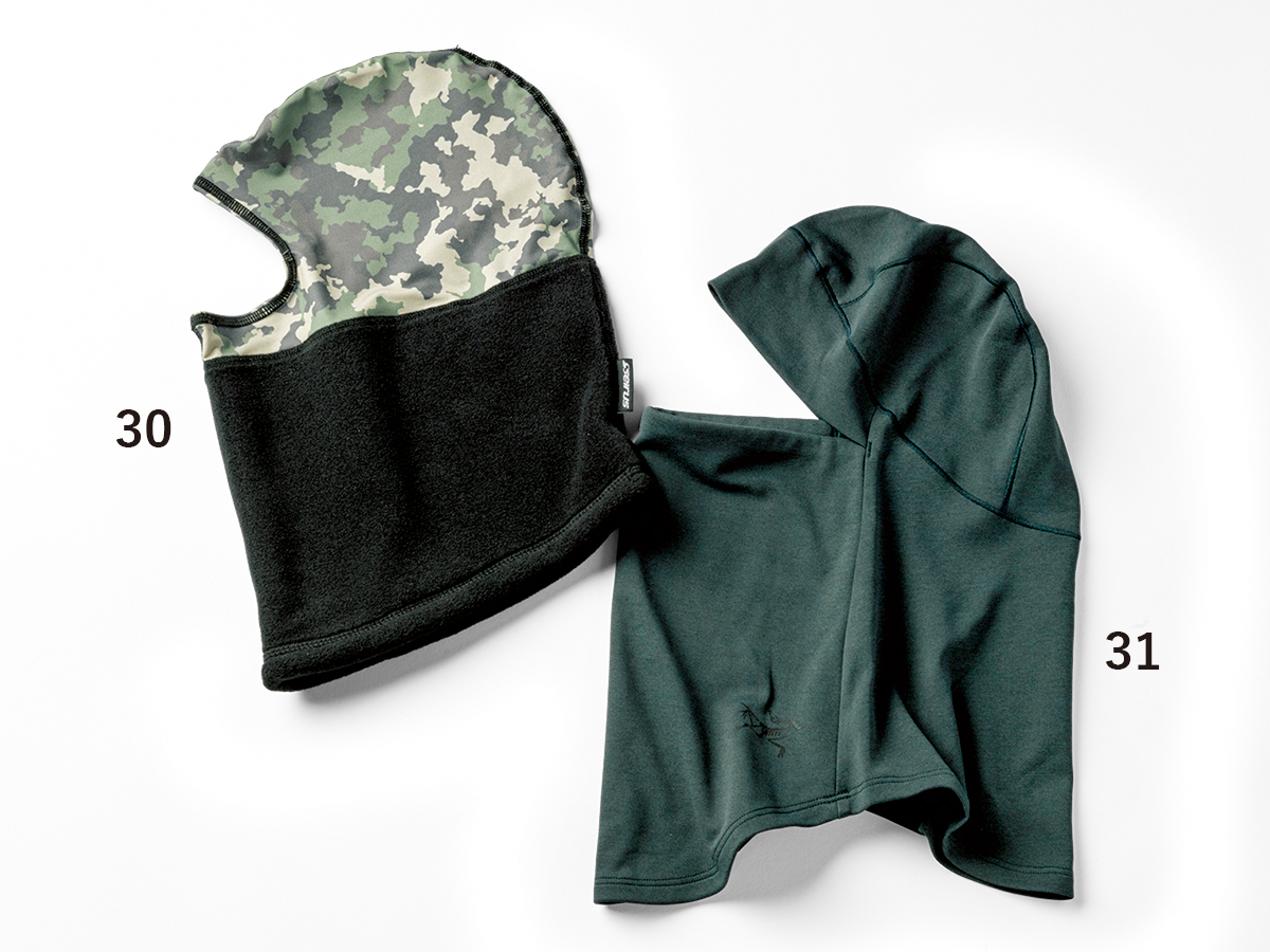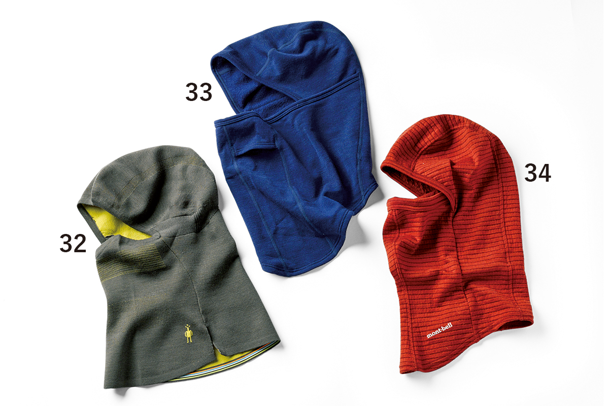 寒さや冷えを感じたら、どんな対策を取るべきか。もっとも簡単な防寒方法はジャケットのフードをかぶることだ。頭から首に冷気や冷風が当たらなくなるだけで、驚くほど身体は温もりを回復していく。というのも、首も含めた頭部から体温の7割が逃げていくといわれる。だからフードにプラスして、ウールや化繊素材の保温と吸湿速乾に長けたヘッドウエア=帽子やバラクラバで頭部を包めば、防寒効果はてきめんだ。ちなみに冬山の登りでヒートアップして汗をかきそうになったら、汗冷えを防ぐため、早めに脱げば温度調節ができる。ヘッドウエアは、防寒、温度調節に即効性のあるウエアなのだ。