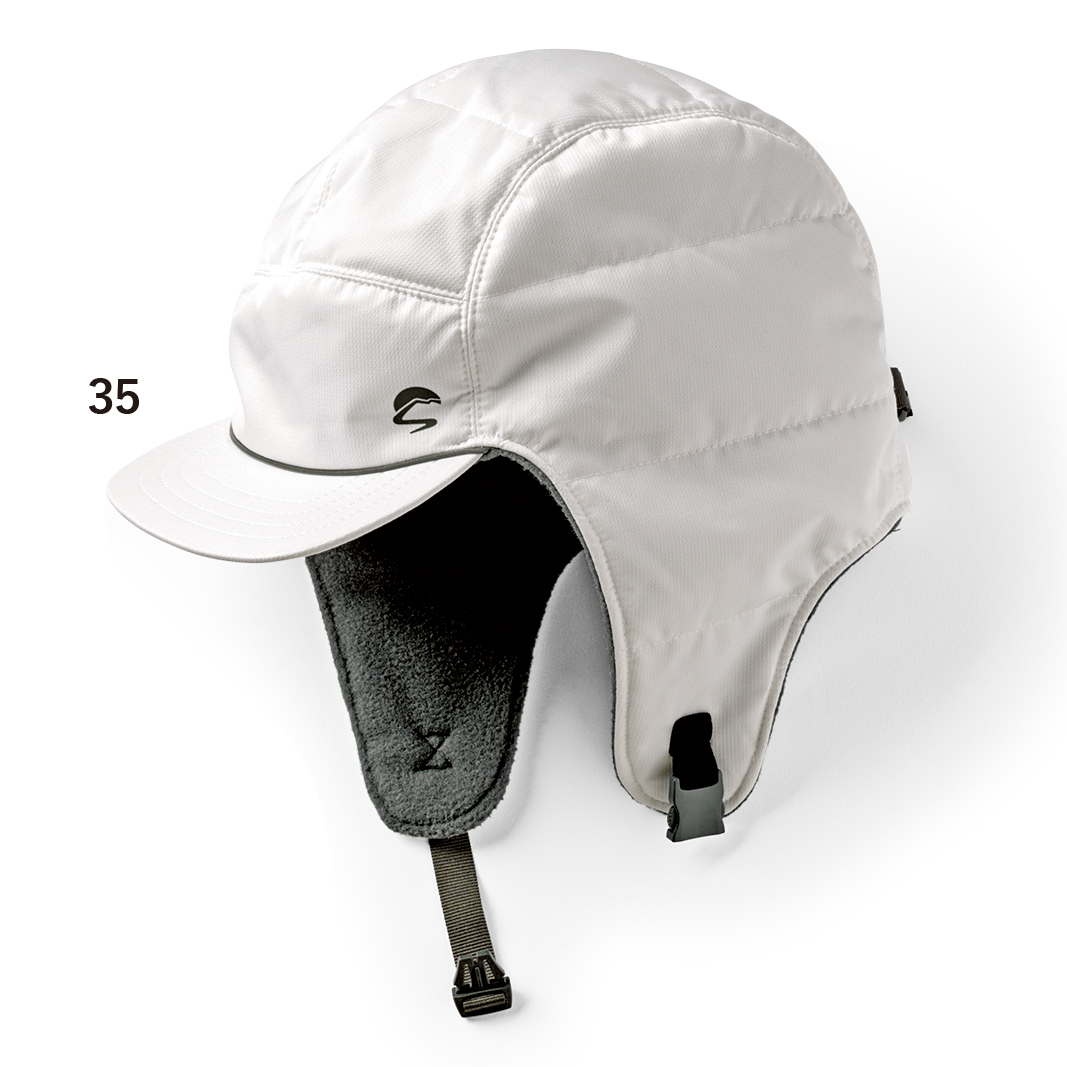 頭の上、またはあご下で固定できる耳当ては、薄いフリースが張られてしっかりと暖かい。頭部にはプリマロフトの中綿を封入。ツバは大きく激しい雪でも視界を確保。サイズ調節できるテープも装備、風にも強い。