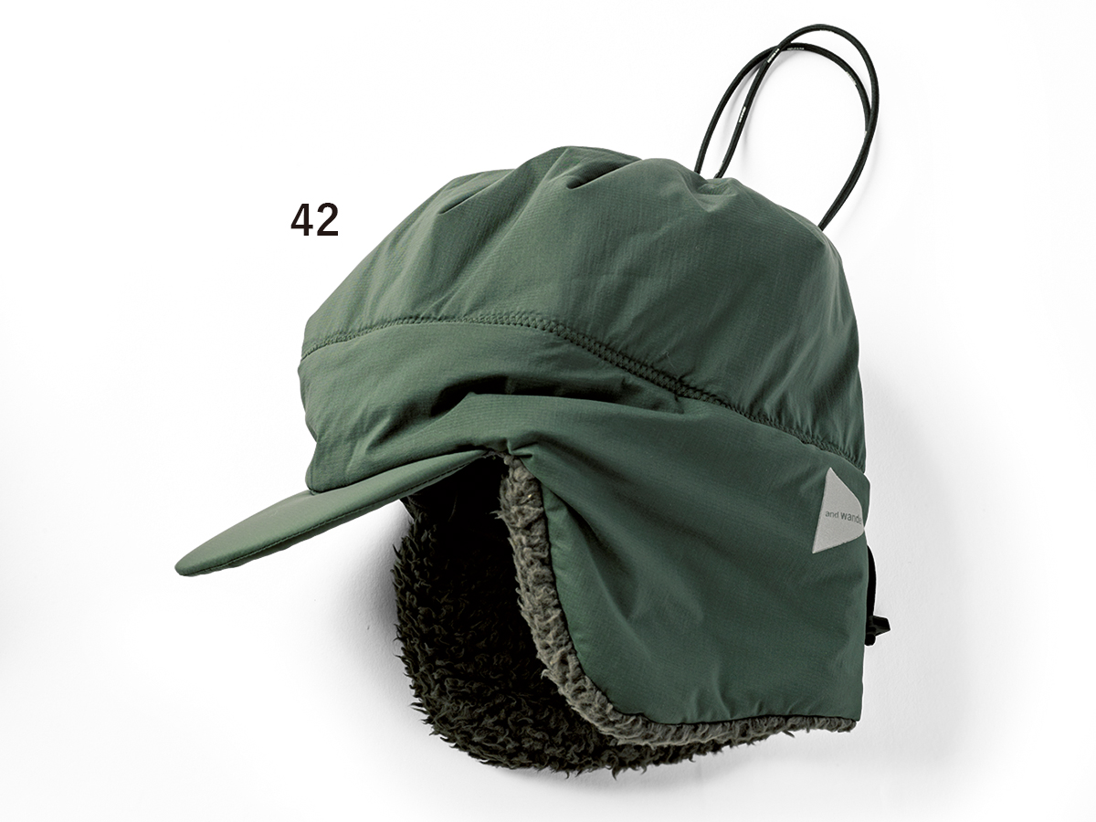 冷風下で耳を温め、内側に折ってしまえる耳当て装備のワークキャップ。風を防ぐナイロンリップストップの表地、空気をたっぷり含む化繊中綿を封入。ふんわりとした暖かさは、冬のスローハイクにぴったり。