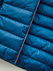 ギャザーでフィットし、包まれるような着心地。バッフルはボックス構造で、内部の隔壁には帯状の化繊綿を使用。隔壁は体の表面に対して斜めに配置してあり、ウエアが潰れると縫い目を塞いでコールドスポットをつくらない。