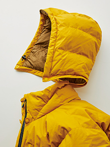 撥水加工を施したリサイクルダウンをリサイクルナイロンで包んだ一着。シェルは伸縮性を備えて動きやすい。裾のうしろは長めにデザインしてあり、上体を曲げても腰が出にくくアウターとしても使いやすい。