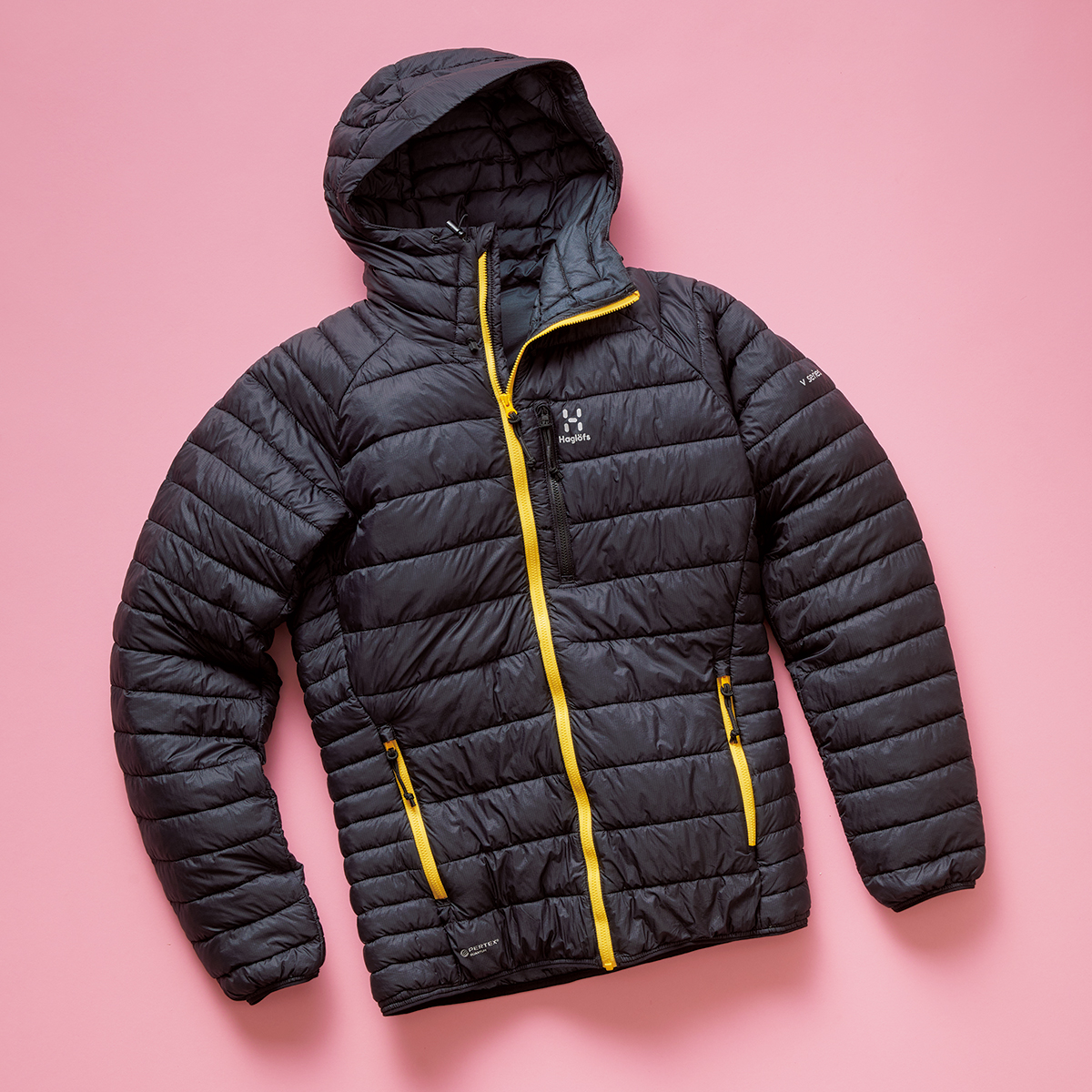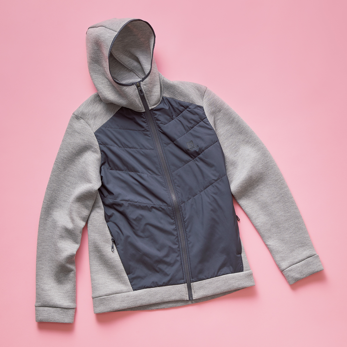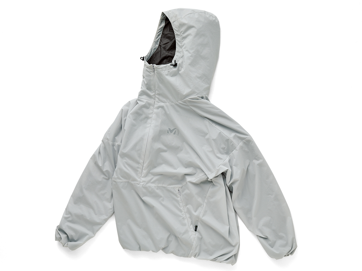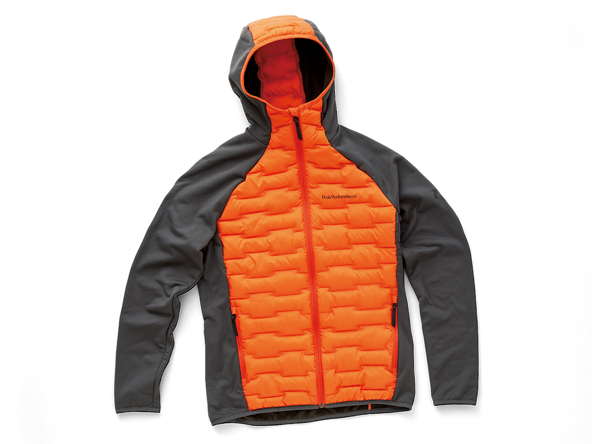 前身ごろのみに化繊の綿を封入したフーディ。フードと袖はポリエステルとビスコースにポリウレタンを混紡した素材で、伸縮性が高く、コットンのような心地よさ。低山のハイキングに似合うカジュアルな一着。