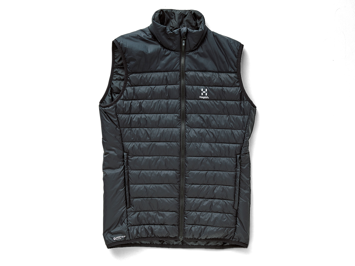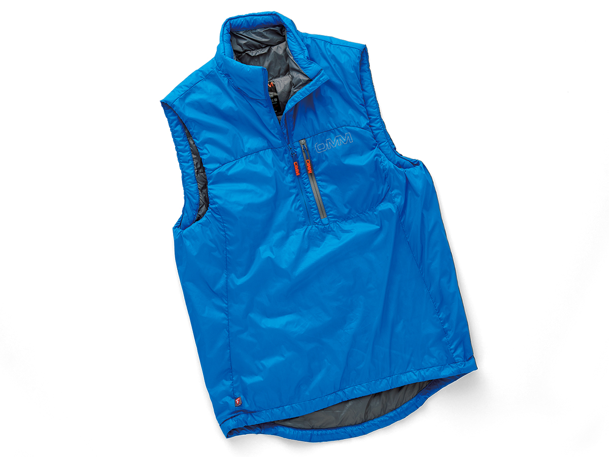 「ミミックゴールド」はリサイクルポリエステルでつくった中綿。ダウンのような粒状で、軽く柔らかい着心地とコンパクトな収納を可能にする。シンプルなベストだが、長めの丈で腰までしっかりカバーして暖かい。