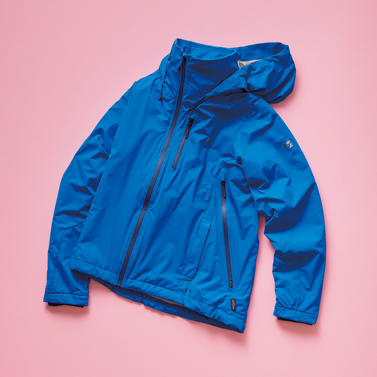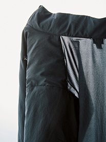 表地は身ごろと袖の上部にリサイクルナイロンをベースにしたパーテックス生地、脇と袖の下側にストレッチパネルを使い、裏地にテイジンのオクタを当てた。シャツのような感覚なので、季節を問わず重宝する。