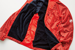 「防風透湿のフロウラップに保温着を合体させたら、より快適では」。アルパインクライミングやBCスキーを楽しむ同社スタッフのそんなアイデアから生まれた新作。裏地には吸汗速乾に優れる生地を当てている。