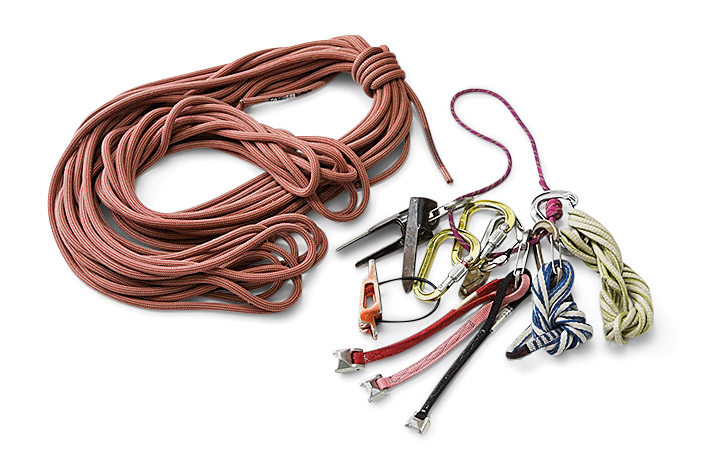 8mm×30mロープ、カラビナ×5、アングル×1、ナイフブレード×3、確保器、トライカム×3、スリング×2、捨て縄。