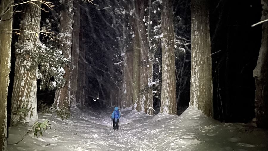 近ごろ流行のパワースポットとして有名になった戸隠奥社。参道入口から随神門を経て奥社まで往復すると約4km。例年ならばトレースもついているのだが、今回は大晦日の悪天候もあり、行きは吹雪のなか、ノートレースで深い場所でヒザまでのラッセルに。やっと半分の随神門の辺りまで歩いたところで、防寒長靴&ツボ足の地元のおじさん2名にあっという間に追い越されてしまった。それでも私は三番手となり奥社に23時56分に到着。無事二年参りをすることができた。今年はなにかいいことがある、そんな気がする。