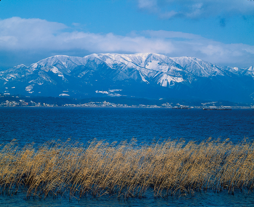琵琶湖の対岸から望む比良山地。標高は決して高くないが、雪を被り湖上に浮かぶようにどっしりと構える山容は見応えがある。