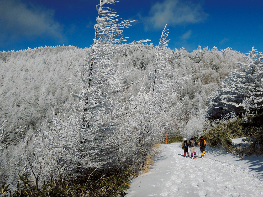 「名古屋市から約1時間半で樹氷の世界にアクセスできる好立地がおすすめポイント。富士見台までの行程で、カラマツの林に現れる霧氷など雪山を堪能できる絶景が広がります。積雪が多いときはスノーシューがあると便利で、笹原の上を自由自在に歩いてスノーシューハイキングを楽しみましょう。稜線では南アルプス、北アルプス、御嶽山、白山などを望めます」(アルススポーツ・羽場崎さん)