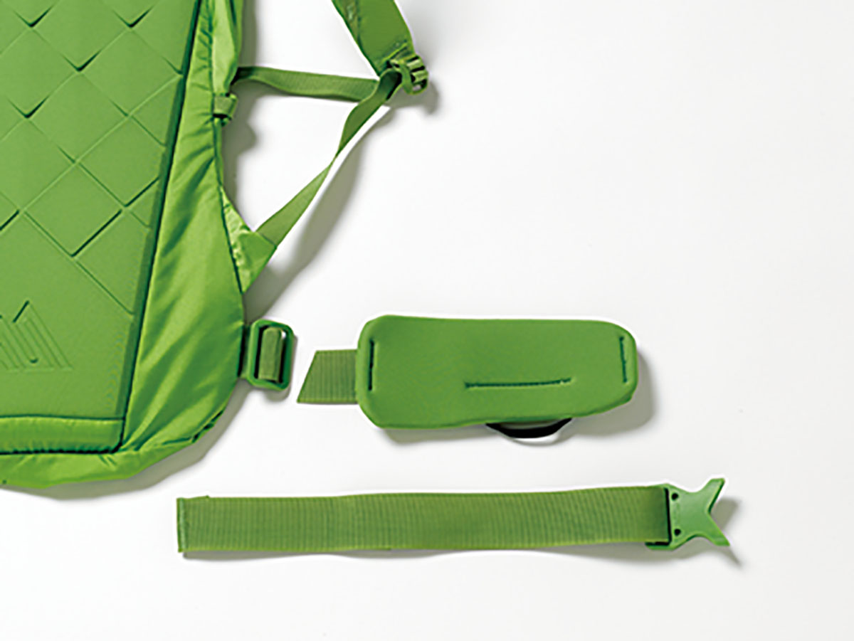 夏山登山からクライミング、バックカントリーまで使える新作です。スキーやスノーボード、アイスツールの取り付けに使う2本のストラップは、使わないときには本体にスマートに収納ができます。雪の付着を最小限に抑えられるフラットな表面も特徴的です。