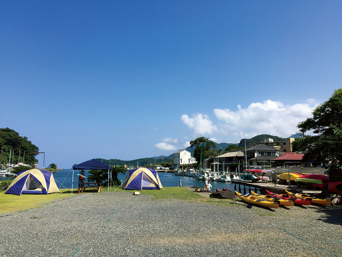 自然豊かな伊豆半島の西伊豆・松崎港に隣接したキャンプ場で、目の前には美しい海が広がる。場内にはスロープがあり、シーカヤックやSUPで海へのエントリーが便利だ。ほかにもハイキング、釣り、サイクリングといったさまざまなアクティビティも楽しめる。徒歩で海へ行けるのもうれしい。