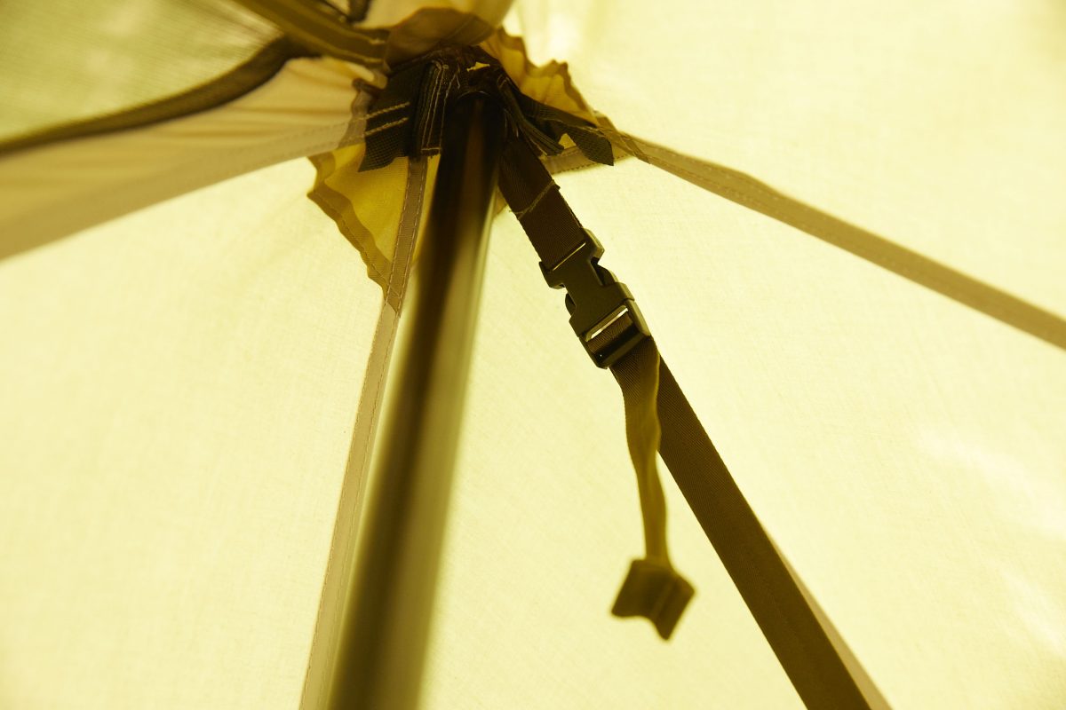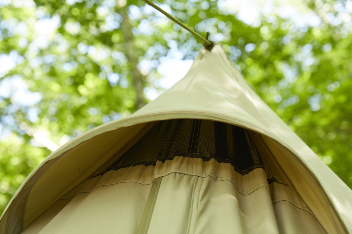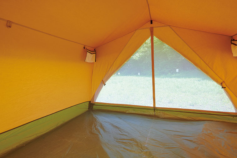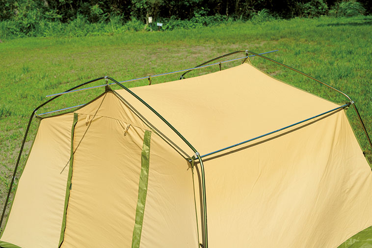 幕体はコットン混紡のTC素材で、シングルウォール。「夏涼しくて冬暖かい」「高い遮光性」「難燃性で火の粉に強く、焚き火の側でも使いやすい」といった特徴を備えるだけでなく、風合いのある生地がロッジ型のデザインにマッチする。また、フライシートにはポリエステルを採用。TC素材の本体を撥水加工とUVプロテクション加工された生地でガードする、各素材のいいとこ取りをした構成も見逃せない。