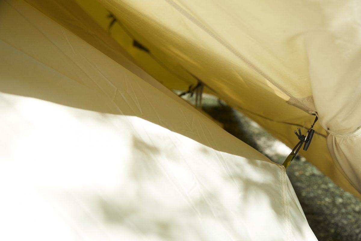 デザインに定評のある鎌倉天幕の製品のなかでも、2本のポールから落ちる弧線、ポール間を結ぶ稜線がとりわけ美しいシェルター。コットン混紡のTC素材がもつナチュラルな風合いと清潔な生成り色も、その存在感を高めている。加えて、8つある幕体の頂点を起ち上げることで日差しを効果的に遮れたり、緩やかに接地する裾部分が雨風の吹き込みを防いだりと、デザインが機能を兼ね備える点も魅力だ。