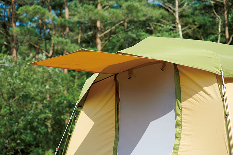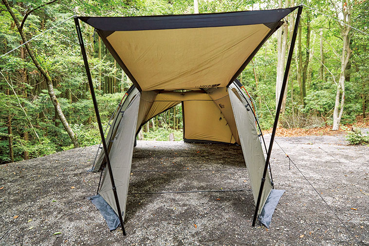 幕体は結露に強いダブルウォールを採用。アウトフレーム構造によってフライシートだけでも立ち上がるので、巨大シェルターとして活用することもできる。付属のインナーテントはファミリーキャンプでも十分な広さを備え、荒天時でも簡単に設営&取り外し可能な吊り下げ式である点も心強い。フライシートの接地面にスカートを備えるのも抜け目なく、その高次元な機能で1年をとおして活躍してくれるはずだ。
