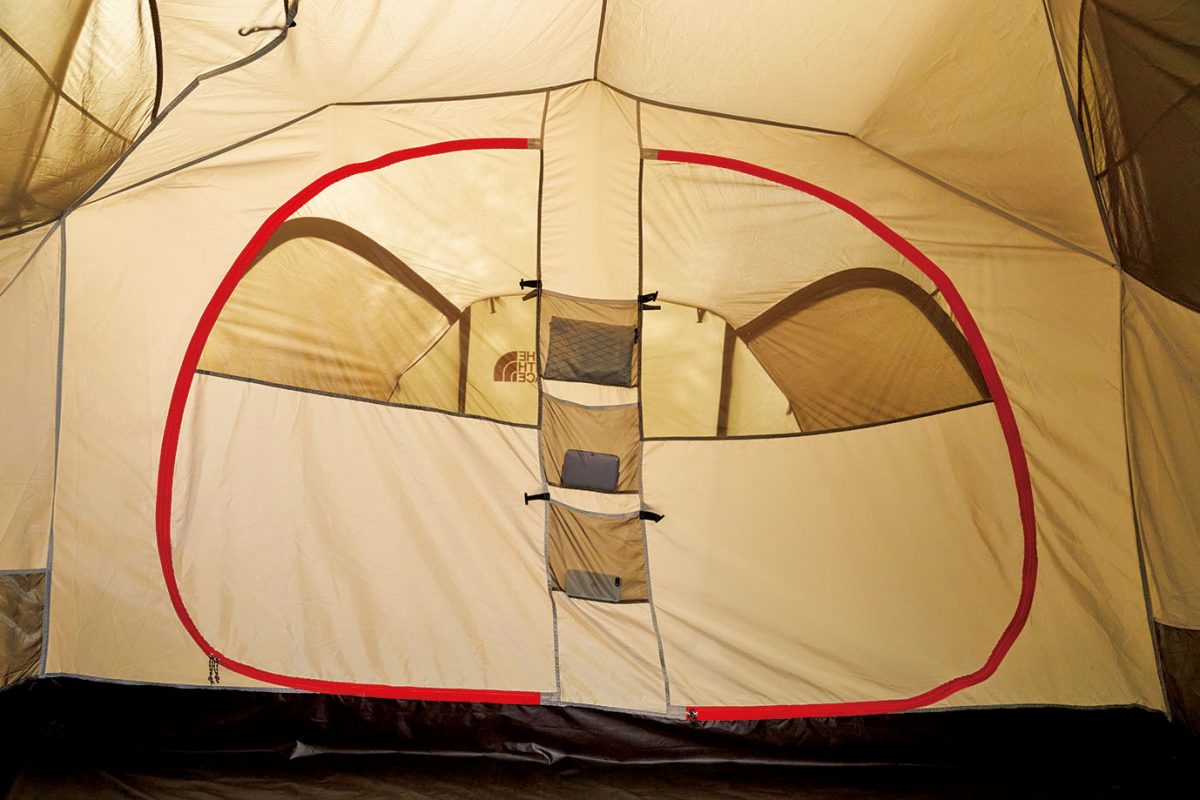 ザ・ノース・フェイスが送り出す、オートキャンプ向けの6人用2ルーム。同社の名作テント「カイジュウ」や「ワオナ」を思わせるフォルムながら、前室のフロントパネルをキャノピー状にせり出せる点が異なり、さらに広々としたリビングスペースを設営できる。