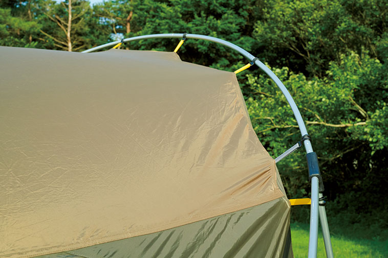 アウトフレーム構造でもあるため、フレームを組み立てて幕体を吊るすだけで設営が完了する。このサイズ感であれば、大人ひとりでも簡単に張ることができるだろう。なお、別売りの「ワゴントップガレージ」を用いることで前室空間を拡張することも可能。2ルームテント的に使えるようになるので、家族や友人とのキャンプで広めのリビングがほしいときは活用したい。