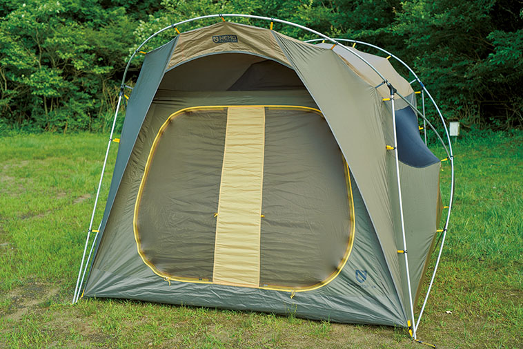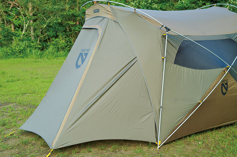 ほかに類を見ないユニークな形状のフレームが目をひく4人用のテント。側面でクロスするフレームによってサイドウォールを外側に膨らませるだけでなく、203㎝の高さも相まって、フロア面積を超えた居住空間を生み出す。また、山岳テントに定評のあるニーモらしく、軽量なシングルウォールを採用。