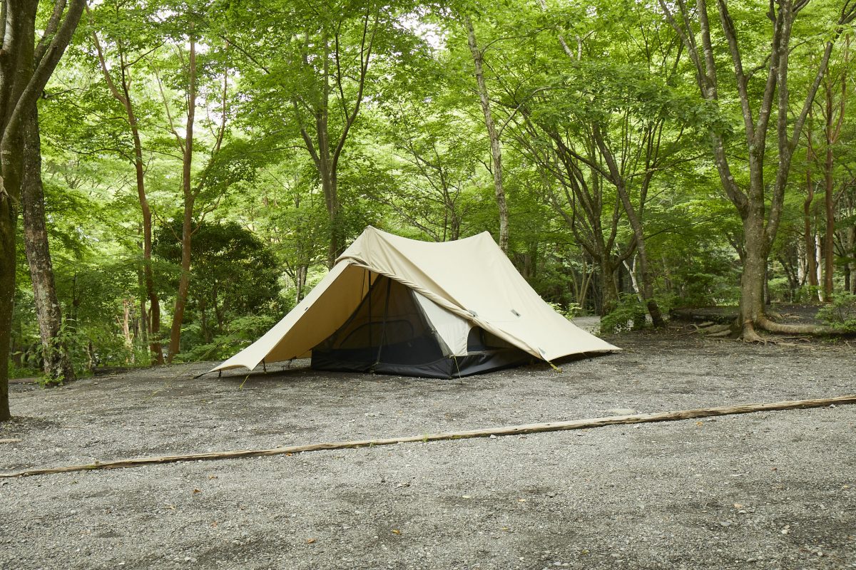 デザインに定評のある鎌倉天幕の製品のなかでも、2本のポールから落ちる弧線、ポール間を結ぶ稜線がとりわけ美しいシェルター。コットン混紡のTC素材がもつナチュラルな風合いと清潔な生成り色も、その存在感を高めている。加えて、8つある幕体の頂点を起ち上げることで日差しを効果的に遮れたり、緩やかに接地する裾部分が雨風の吹き込みを防いだりと、デザインが機能を兼ね備える点も魅力だ。