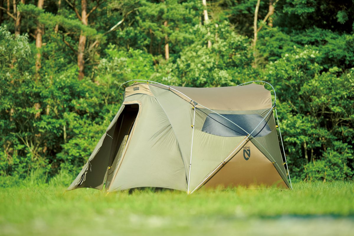 ほかに類を見ないユニークな形状のフレームが目をひく4人用のテント。側面でクロスするフレームによってサイドウォールを外側に膨らませるだけでなく、203㎝の高さも相まって、フロア面積を超えた居住空間を生み出す。また、山岳テントに定評のあるニーモらしく、軽量なシングルウォールを採用。