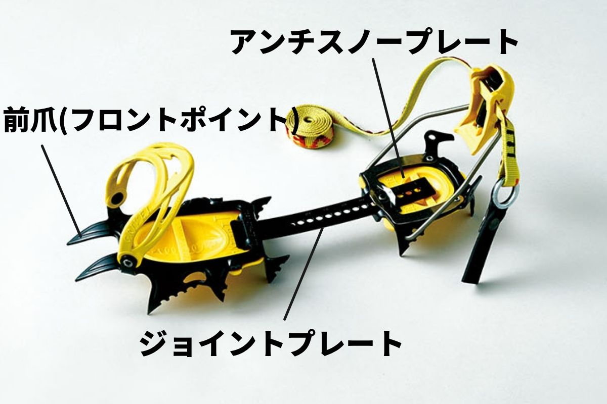 クランポンには3つの部位があり、それぞれ「前爪(フロントポイント)」、「ジョイントプレート」、「アンチスノープレート」と名称があります。部位ごとの役割も覚えておくと、クランポンを選ぶときに役立ちますよ。