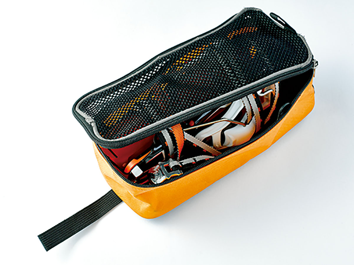 クランポンをバックパックに入れて持ち運ぶときは、丈夫なケースの中に収納します。ほかのウエアや装備を傷つけないようにするためです。
