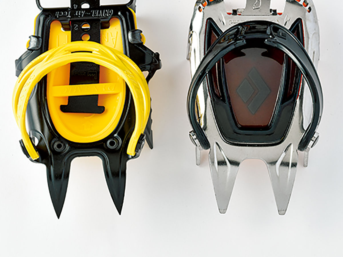 逆に、前爪の先端が縦に長いのは「縦爪」と呼ばれています。硬い氷にも蹴りこみやすいいっぽう、雪壁では雪を捉えづらいというのが難点です。