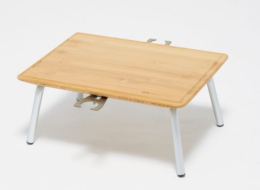 ワイングラスホルダーが付いたコンパクトなピクニックテーブル。天板には同社のカッティングボードと同素材が使われ、汁気のしたりを防ぐ溝が掘られているので食材の直置きも可能だ。