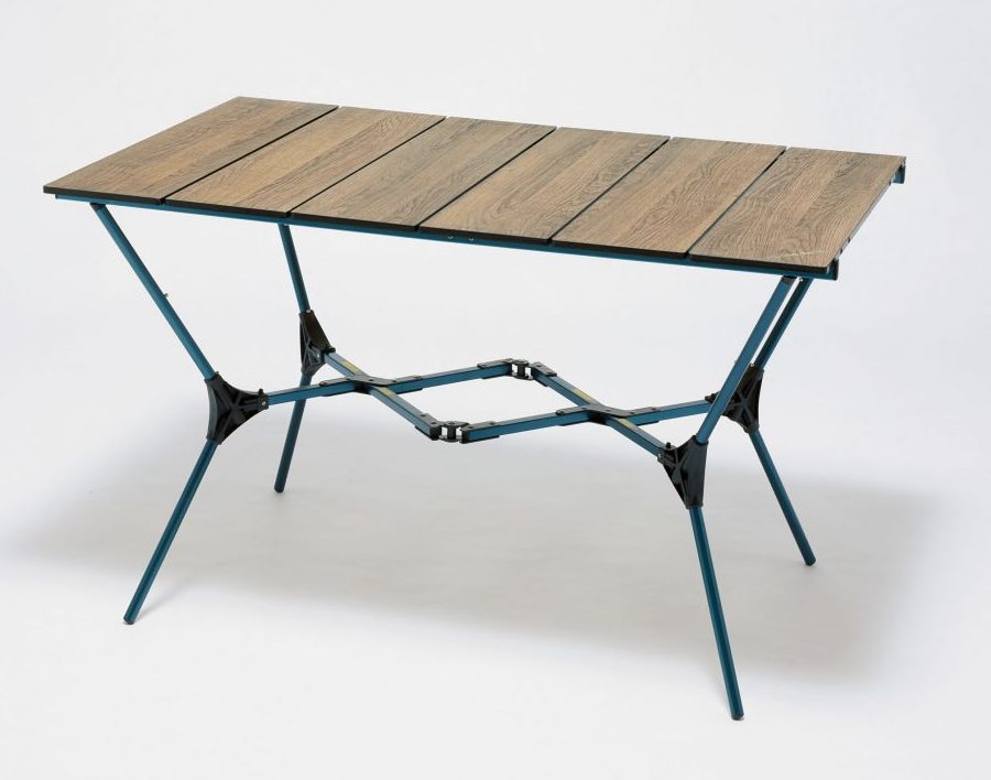 ブランド独自の構造であるハイローザシステムを採用したテーブルは、コンパクト収納と三段階の高さ調節を兼備。天板もリバーシブルに使える仕様となり、気分に合わせて変えられる。