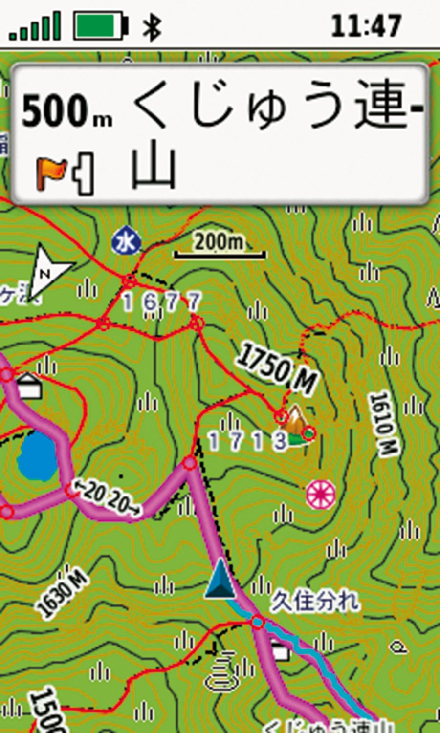 日本詳細地形図(2500/25000)を搭載。等高線が見やすく登山道や危険箇所などはわかりやすく描画されているので、行動中でもすばやく情報を把握できる。